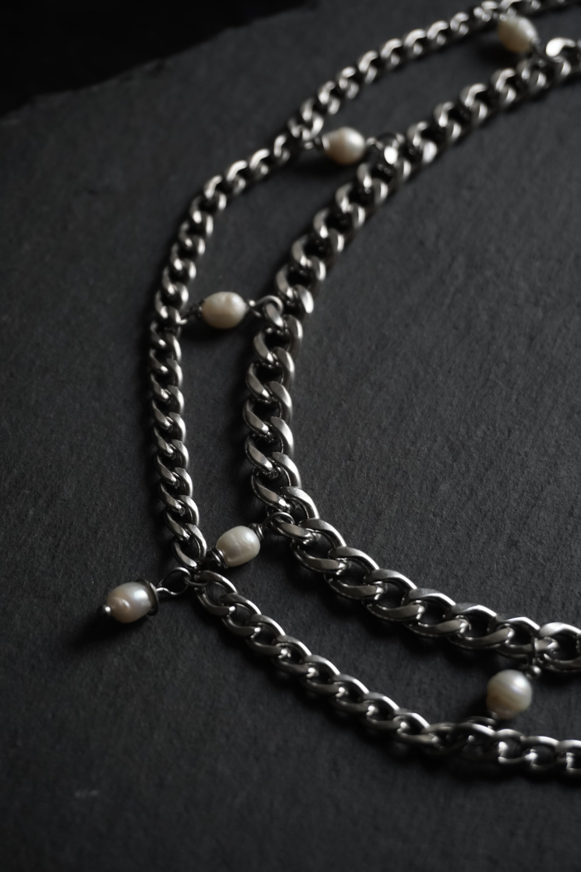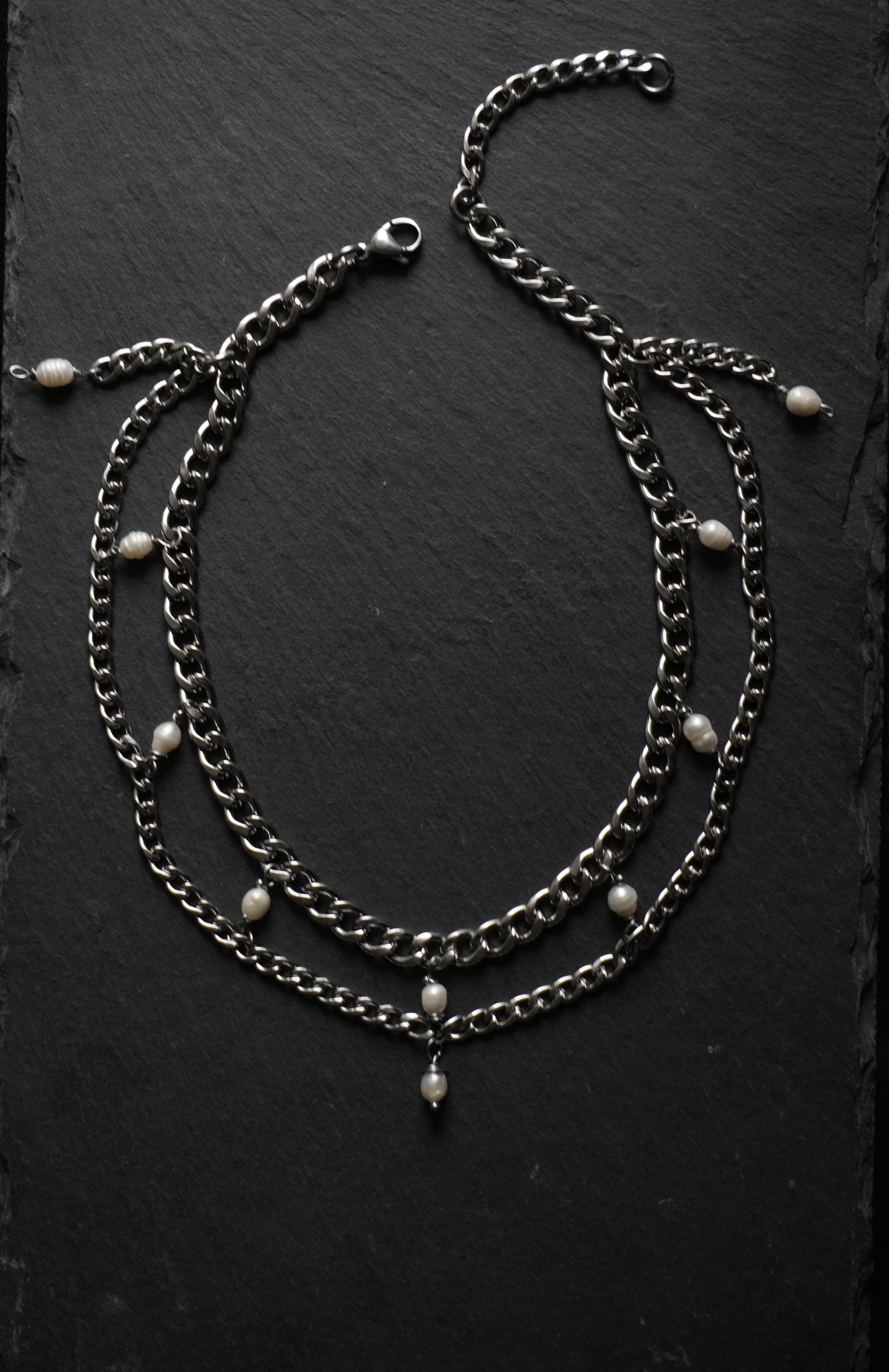 a stainless steel chain necklace embellished with real pearls
